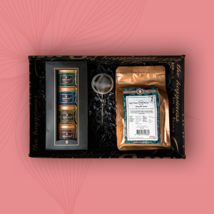 De happinessbox bevat een luxe giftset van vier verschillende topkwaliteit losse theeën*, een trendy zwarte theezeef en speciality arabica koffiebonen uit Oost Timor.